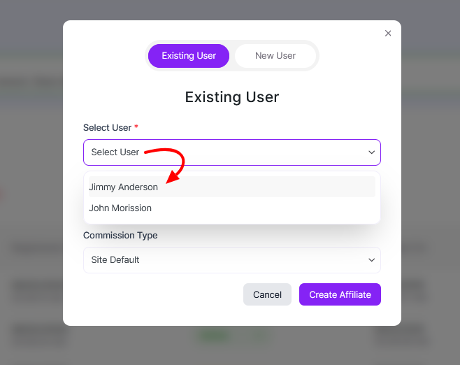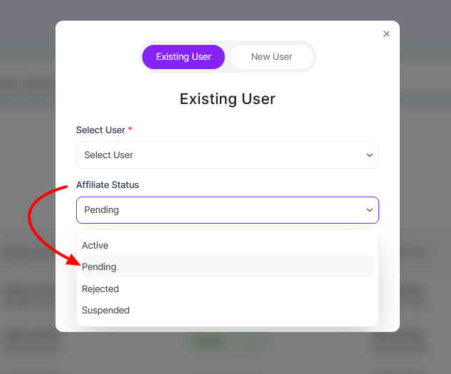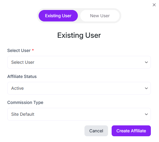 1. Select the Existing User tab. From the Select User dropdown, choose the WordPress user you want to convert into an affiliate.