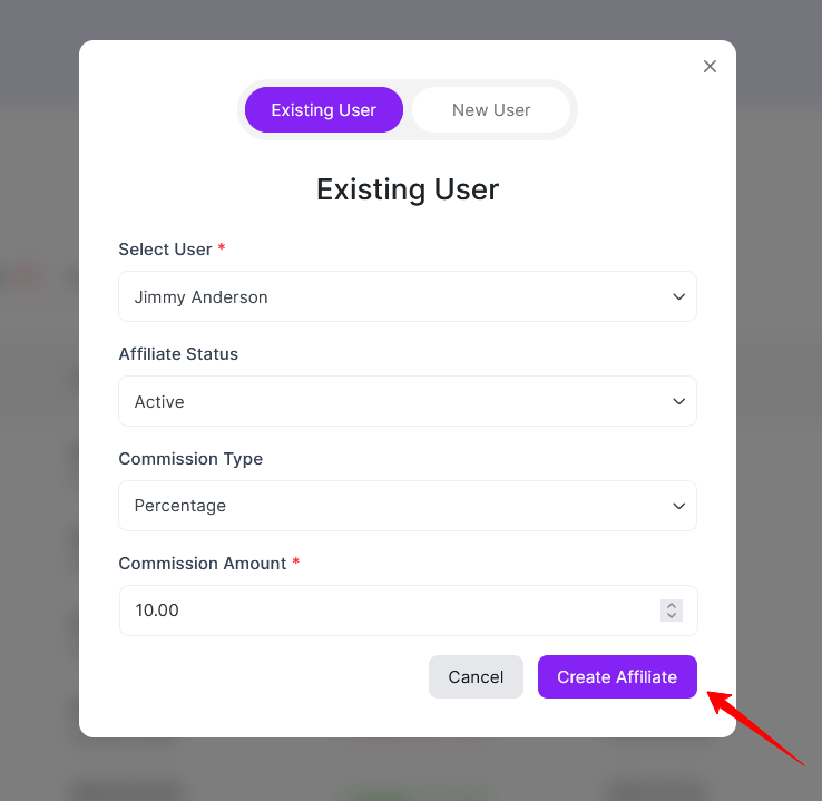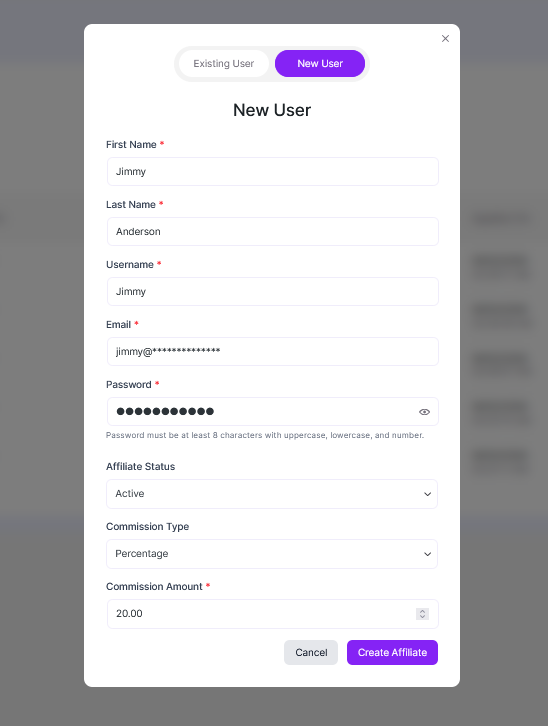 Follow the step-by-step instructions below to create a new affiliate user.