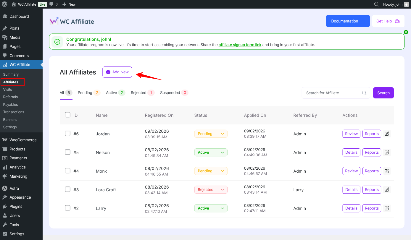 WC Affiliate allows site administrators to create affiliate accounts from the WordPress dashboard manually. This is useful when you want to onboard affiliates yourself, approve selected users, or convert existing users into affiliates without requiring them to apply.