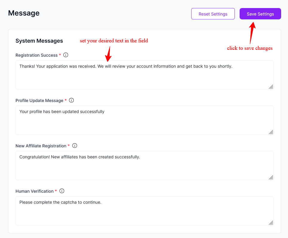 Each field lets you customize the default text shown to affiliates. You can edit the content to match your brand tone and communication style. After making changes, click Save Settings to apply them.
