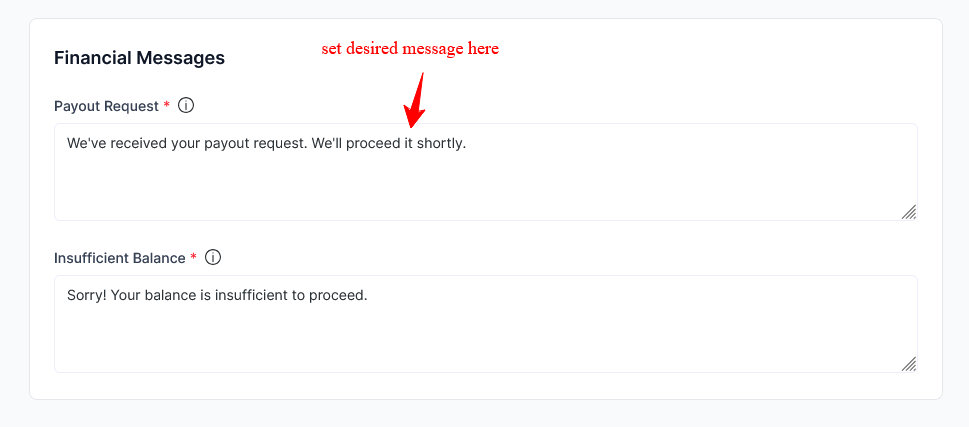 These messages are related to payouts and balance handling. All the messages are set automatically. Here is a brief about the financial message section