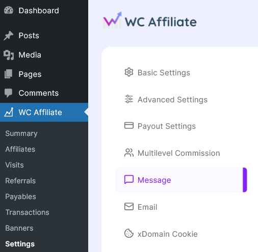 You can find this section by navigating to: WP Admin → WC Affiliate → Settings → Message