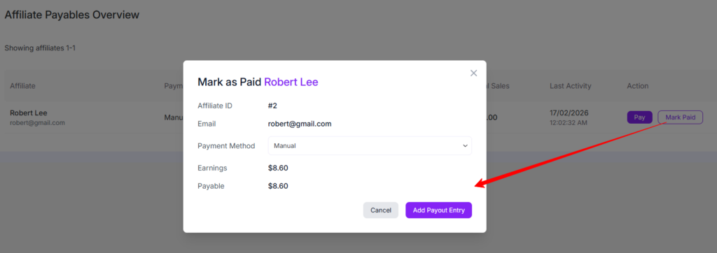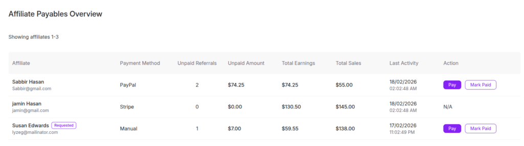 The Payables Overview section allows the admin to view and manage all unpaid affiliate commissions from one central place. This page helps you to track how much is owed to affiliates and process their payments easily.