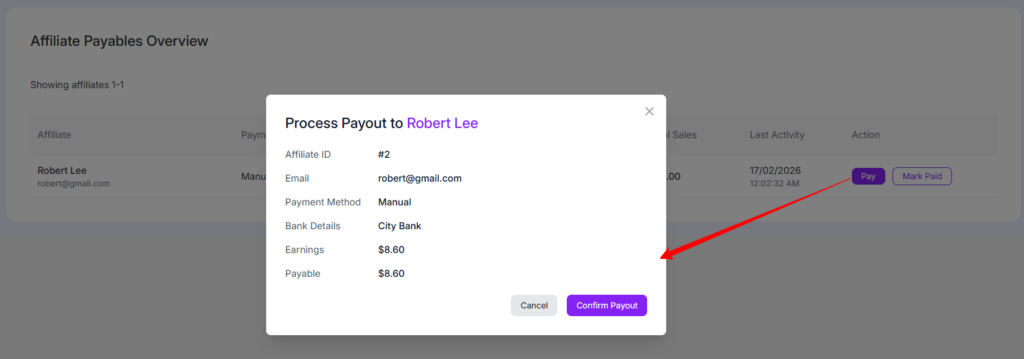 When you click the Pay button, a payout popup appears. This window shows the affiliate’s details including Affiliate ID, email, payment method, bank details (if added), total earnings and the current payable amount. It allows you to review everything before completing the payment.