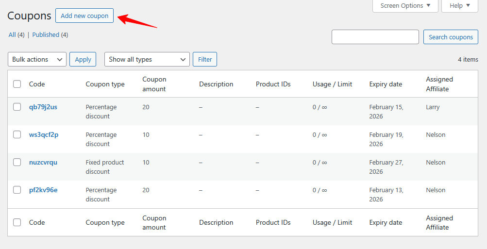 2. Go to WooCommerce > Coupon in your WordPress dashboard. Create a New Coupon to assign a coupon to an affiliate for tracking purposes. For this, you need to click on Add Coupon button. Set a unique Coupon Code  (e.g., Summer30), which the affiliate will share with their audience.