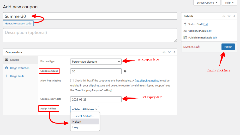 3. Choose the type of discount you want to offer: percentage discount, Fixed cart discount, or fixed product discount. Set the expiration date for the coupon, and from the Affiliate section, select the specific affiliate. Fianlly click on Publish.