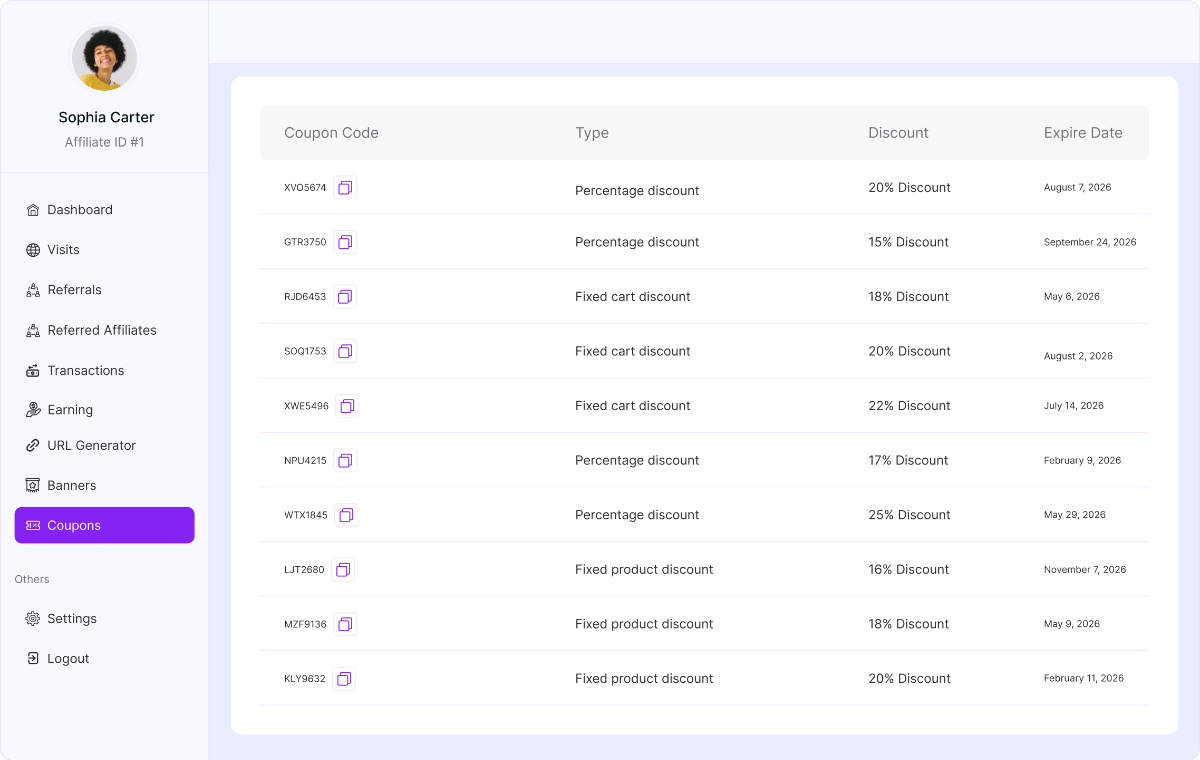 Coupon Code: Displays the unique coupon code the affiliate can share with their audience. Affiliates can copy the code instantly, share it via social media, email, ads, or direct messaging. And also, they can use it in offline promotions.