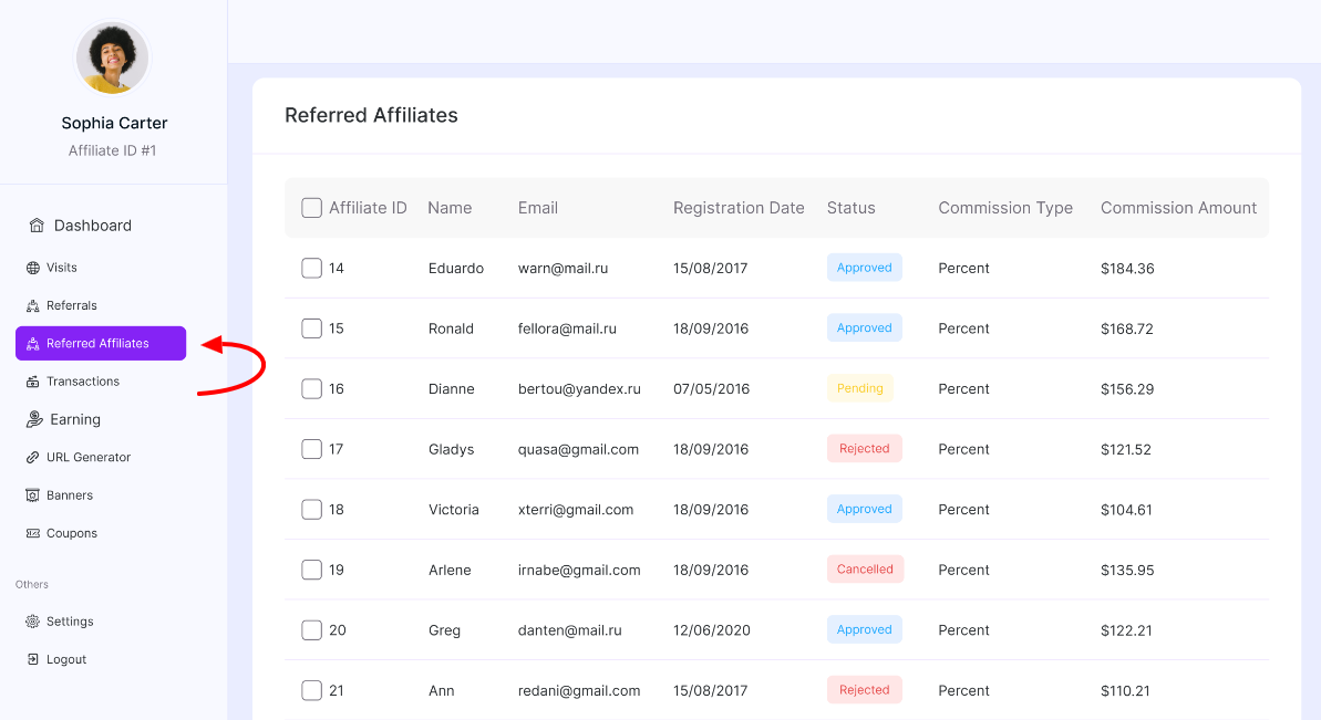 Affiliate ID: Displays the unique ID assigned to the referred affiliate. This helps you quickly identify and manage specific affiliates within your system.