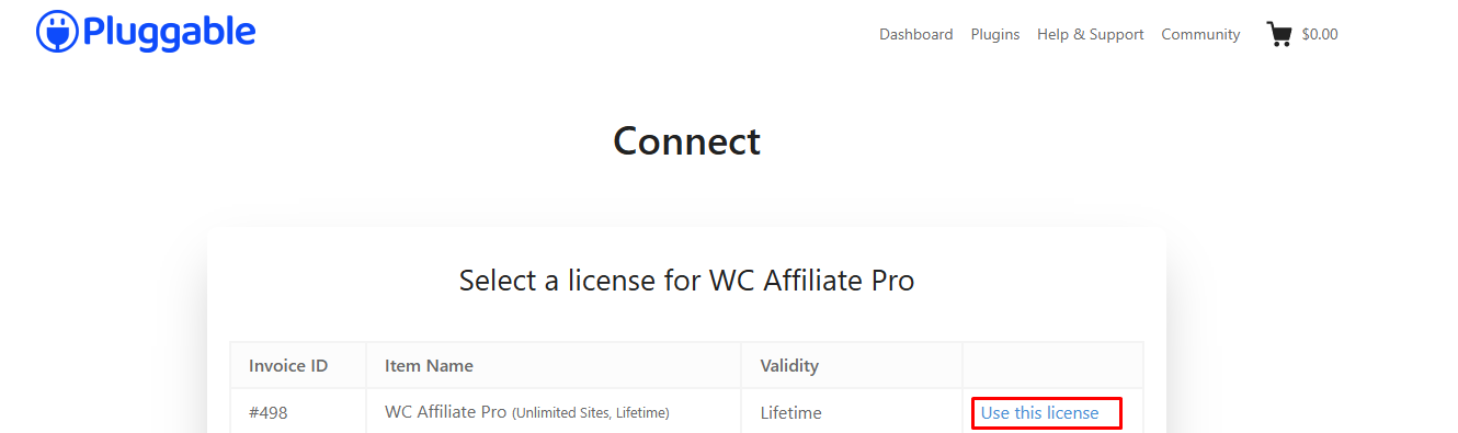 2. Click the green Connect button. Select the appropriate license from your Pluggable dashboard.