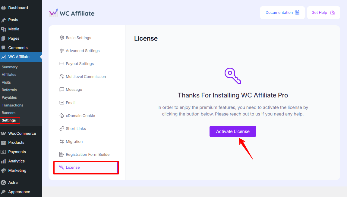 - After activating WC Affiliate Pro, please go to WordPress Dashboard → WC Affiliate → Settings → License