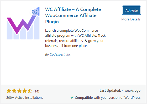1. Click Install Now next to the WC Affiliate plugin. Once installed, click Activate.